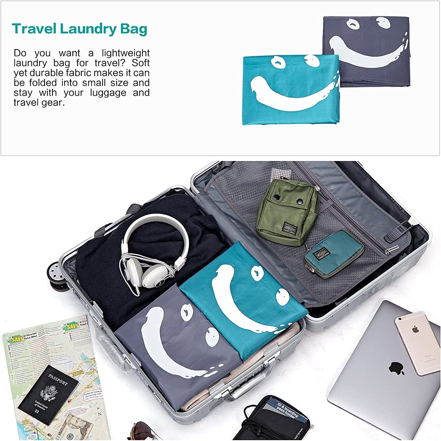2 Pack 65x96cm Wash Me Travel Laundry Bag, Dirty Clothes Organiser