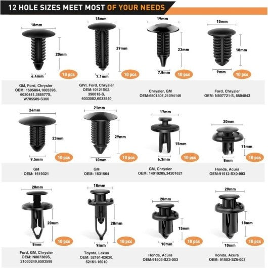 12 Most Popular Sizes : There are 12 most common sizes of clips which will meet your needs, sturdy and reusable, compatible for GM, Chrysler, Ford, Toyota, Nissan, Mazda. Hyundai, Kia, AMC, Jeep, etc…
