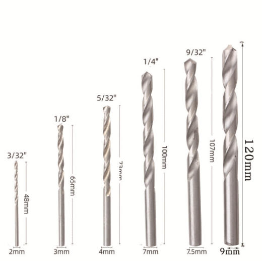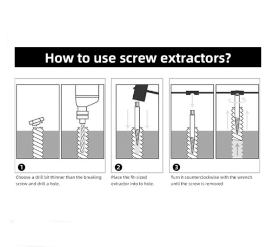 SCREW EXTRACTOR AND DRILL BIT KIT SIZE:6-Pieces Screw Extractor: 1#, 2#, 3#, 4#, 5#, 6#; 6-Pieces HSS Drill Bit: 3/32", 1/8", 5/32", 1/4", 9/32", 3/8".All these tools are clearly marked.