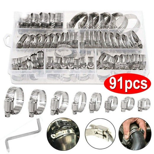 91pcs Stainless Steel Hose Clamps Clips Adjustable Range Worm Gear Pipe Clamp Kit