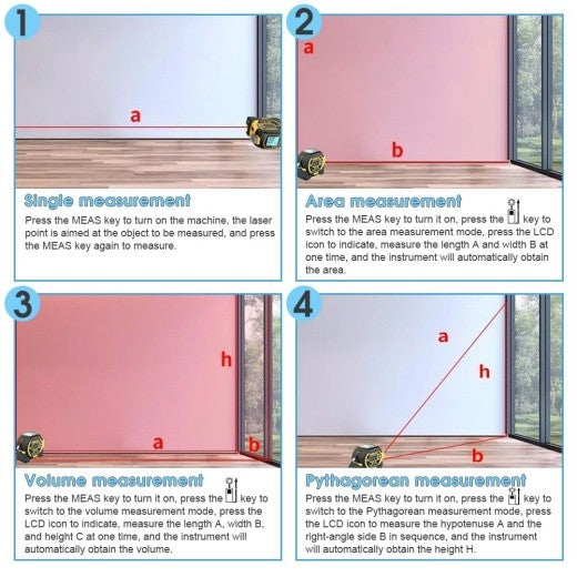 This instrument has a variety of measurement functions such as single/continuous measurement, area measurement, volume measurement, and Pythagorean measurement. With historical data memory function, up to 20 groups of data can be saved.