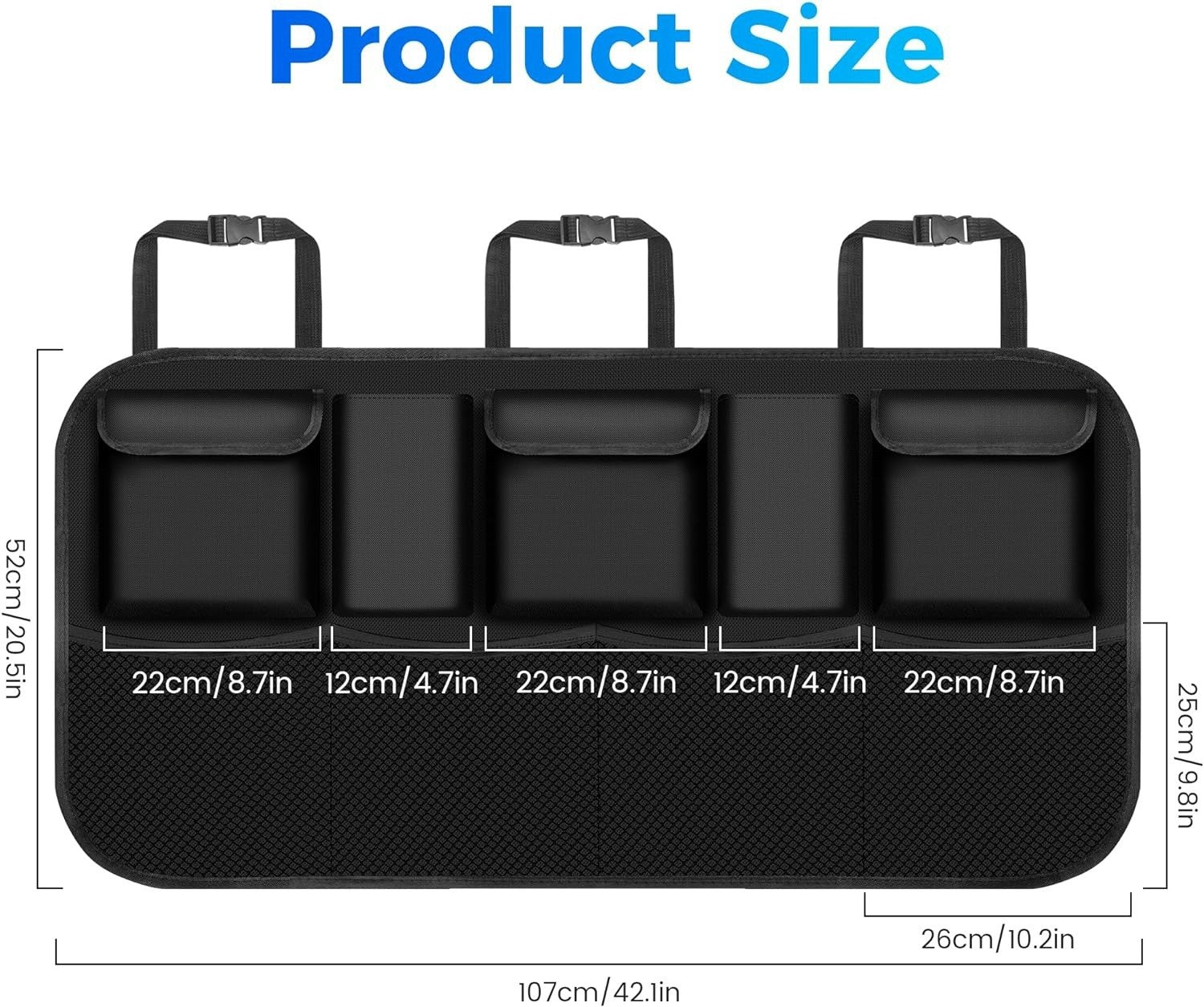 3. Unique Suspension Design: 5 pockets and 4 mesh bags, enough to hold all daily car necessities, emergency equipment, tools, children's toys, baby supplies, pet supplies, sports equipment, or groceries, keeping your trunk tidy. The most important thing is that it doesn't take up as much space as a storage bag. You can store large suitcases and strollers on the trunk floor.