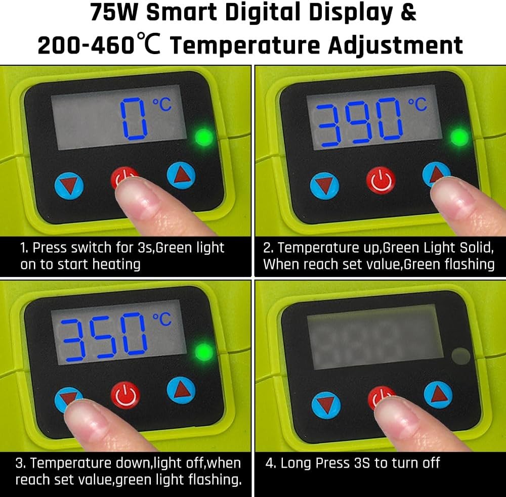 Portable and Fast Heating: Input:20V Max,Power:75W.Press the middle power switch that beside the digital display for 3 seconds,it will light up to start heating.The default temperature for starting is 350℃,the adjustment tem- perature range is 200-460℃.Suitable for soldering wire with a diameter of 0.03''-0.04''.