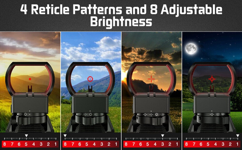 Illuminated reflex sights with 4 bright reticle selections provide various choices to meet different occasions. Red-Dot, Circle/Dot, Crosshair/Dot and Crosshair/Circle/Dot combinations are all in one sight, co-witnesses with your existing metal sights.