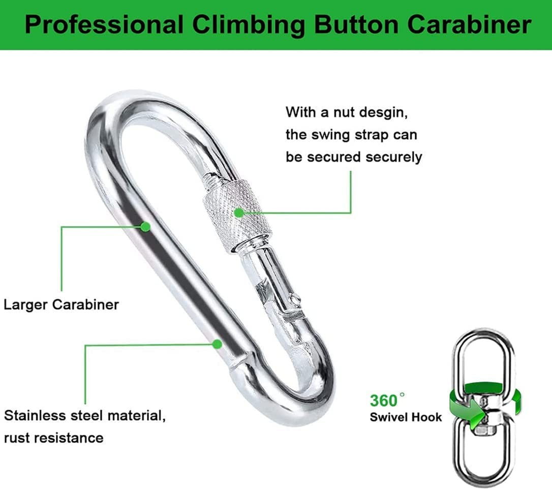 PREMIUM MATERIAL -- swing hanging straps adopt high-density nylon 1000D, better than polyester, to withstand harsh winters and brutal summers.The entire structure of the carabiner is made of industrial strength steel, the surface is nickel plated for enhanced rust and corrosion resistance, making it nearly indestructible.